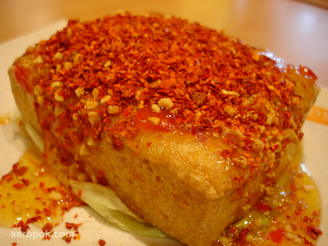 Does this scare you? A piece of Fried Tofu with Thai Chilli Sauce and lots of chilli flakes!
