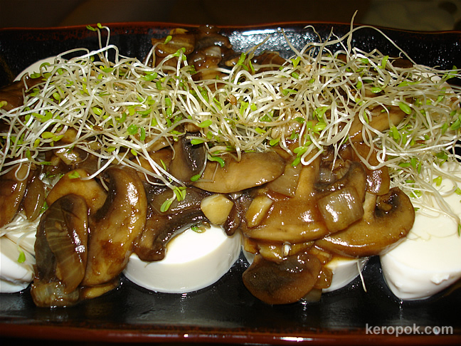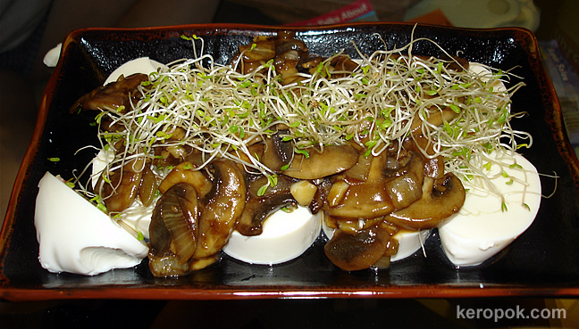 It’s Cold Sauteed Mushroom with Alfafa Sprouts on Cold Tofu.