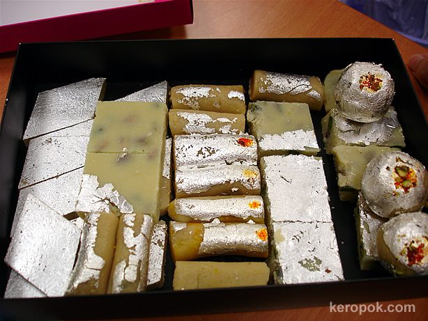 Deepavali Sweets. This box was given by a Indian Prof at my workplace. Previous years he gave some which I think was imported from India, they were too sweet for our liking. This box he gave is Singapore-made/company, thus fits into Singapura Daily Makan ๐Ÿ˜‰