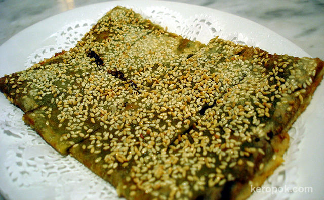 This red bean pancake looks different-a bit more greenish than brownish. And so generous with 芝麻! Not many places do this now.