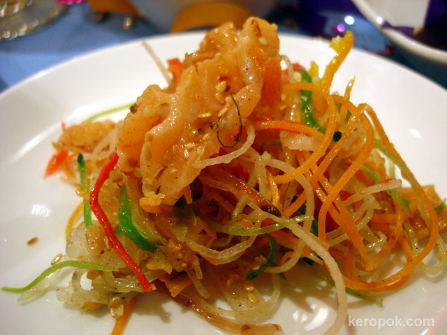 The first dish as usual is Yee Sang for this occasion. The top orangy part is raw salmon. The rest are shredded carrots, cucumbers etc… with keropok!!! of course!!!
