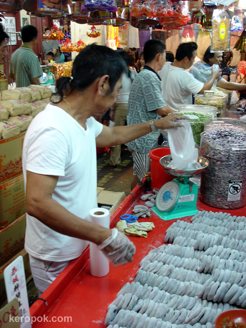 This hip uncle with a pony tail selling persimmons. The small little red plate is where the samples are. He will be snipping them into tiny pieces for everyone to try.