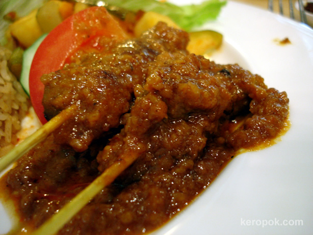 This is it. Fried Rice with an egg on top, 1 piece of fried chicken on the left, achar behind, and satay on the right.