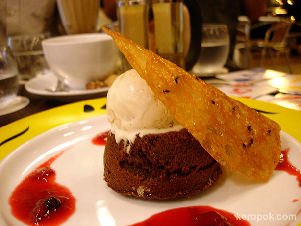 hey, tigerfish, that is actually chocolate lava cake with vanilla ice-cream. Soft chu-ku-lie cake wif warm ozzy choc inside. Makes my saliva droool..
