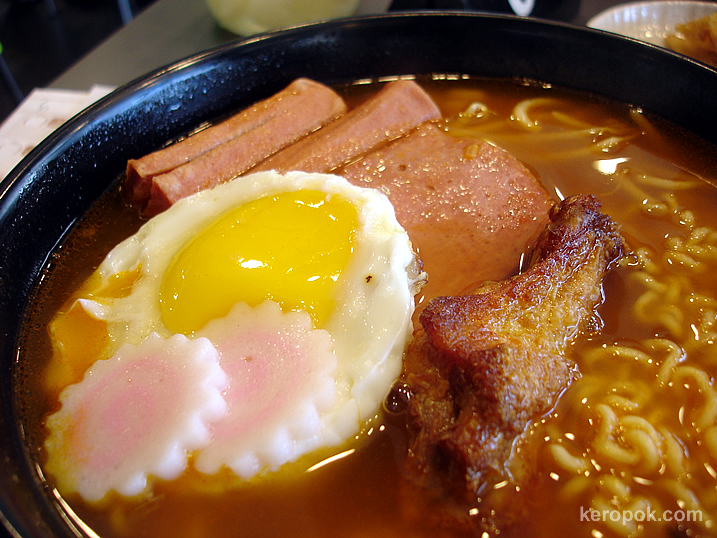 3 of us ordered this dish. It’s spicy korean noodles. It comes with sausages, ham, 2 portions of the chicken wing, sunny side up egg, 2 slices of pink fish cake. We did not know it would be so big!