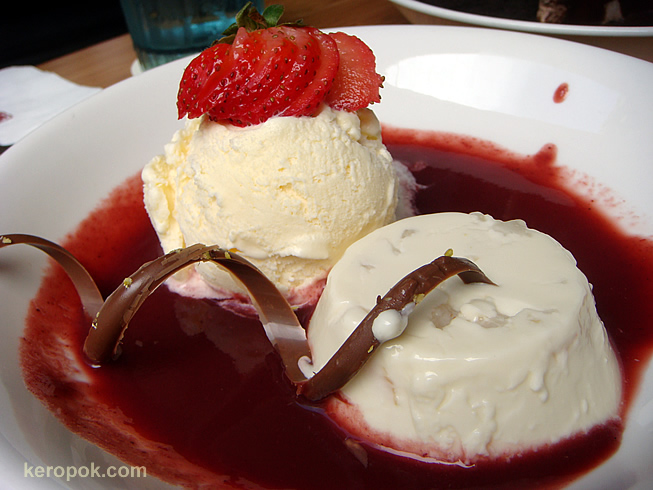 So here it is… Lychee Panna Cotta. The sourness of the strawberry blends in so nicely with the vanilla ice cream. (They ran out of the original ice cream and asked if they could substitute it with vanilla ice cream) Yes yes, we like it! haha…