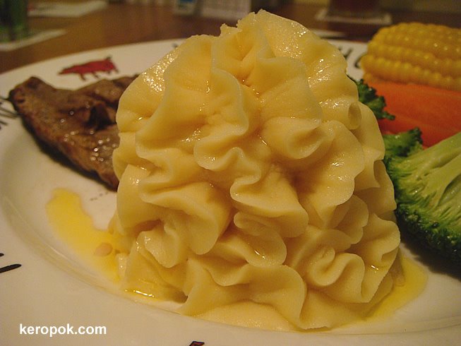 Fries, roast potato or mash. My choice as shown here is the steamed veg and roast potato.
