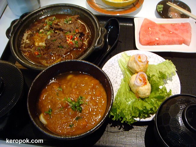 I had the Set Meal. It’s actually very filling. It has the beef and tofu dish, a bowl of rice, a bowl of spicy udon with chicken, 2 cute little balls, soup and fruits.