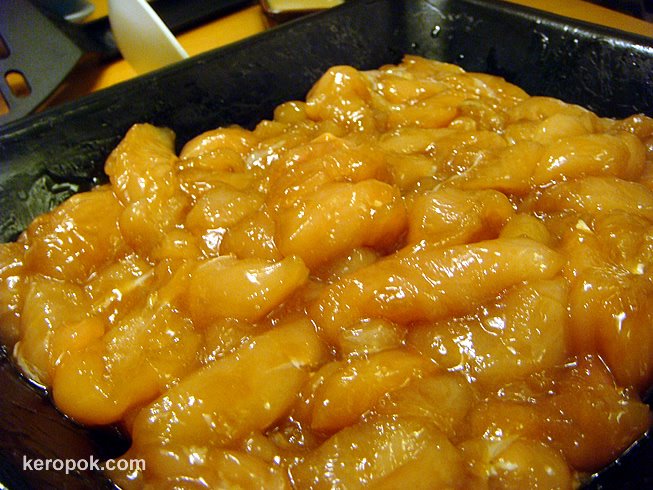 This is the chicken thigh meat that we cut up and marinated. They are delicious after cooking.