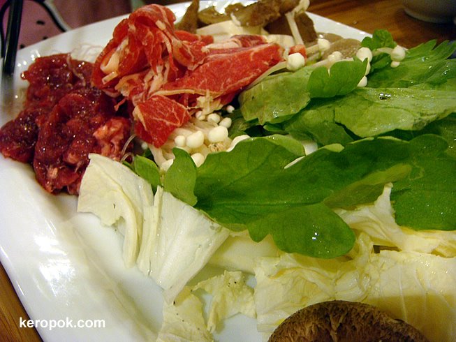 Our cousin wanted to ‘play’ with food, so she had the Mini Beef Set. It comes with a big platter of meat and mushroom.
