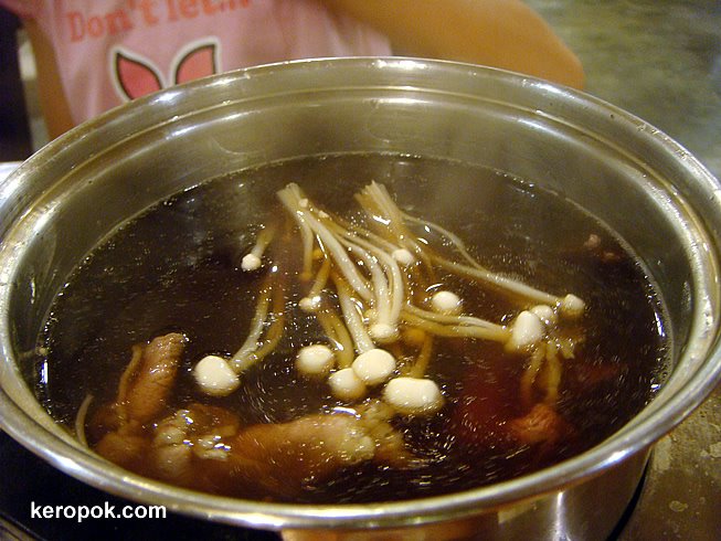 And a pot of mushroom soup. She ‘enjoyed’ cooking her own meal. 😉 It also comes with rice and a slice of watermelon and mushroom salad as well. ($18.80)