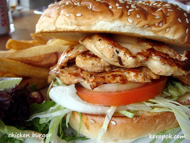 It’s a huge burger. (Bigger than a whopper). Toasted sesame seed bun, with a few slices of chicken fillets with tomatoes, onions and lettuce. Served with chips and salad.