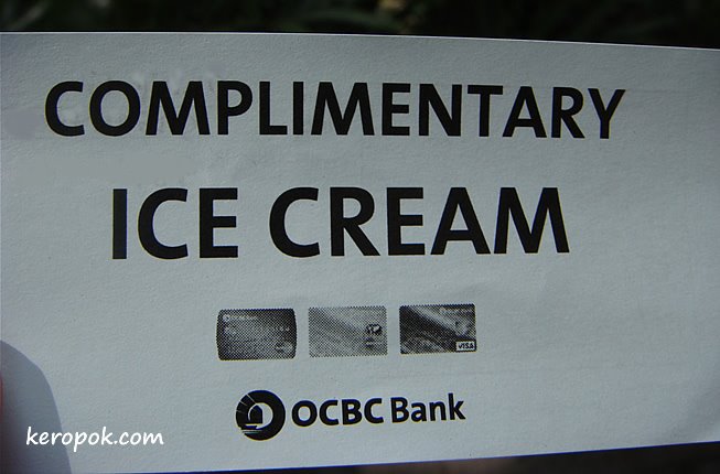 You know the ‘potong’ ice cream carts along Orchard Road, the OCBC people are just beside it, you show any OCBC card, they give you the complimentary ice cream slip, fill in your name and you exchange it for an ice cream. We had chocolate, read bean and chocolate mint.
