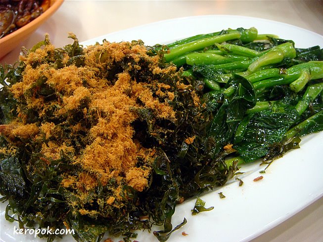 Next was the vegetable. The boss recommended us the Kailan. $12. They prepared it in a 2 in 1 way. The vegetable stems is the way how you expect kailan to be cooked. The leafy foliage above was sliced thinly and deep fried and topped with meat floss.