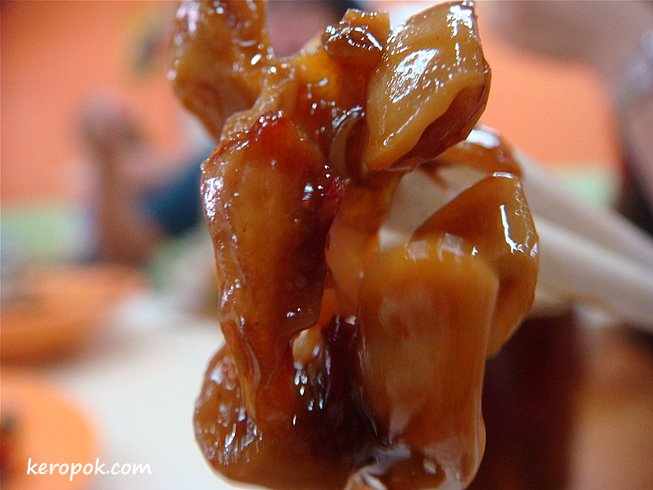 I ate one and only one piece. It’s crunchy, just like eating pigs intestine actually. The sweet and spicy sauce kinda goes well with it. I ate more onions and spring onions instead. ;-p