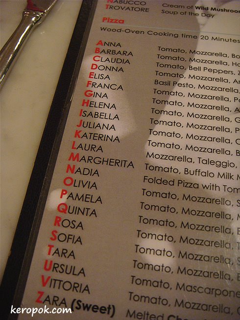 The only photo I took of the menu. I thought it was so interesting that they have the pizza covered from A to Z!