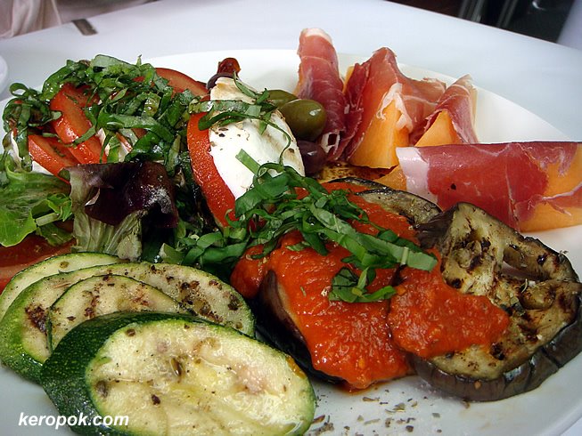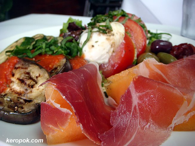 We ordered this to try the Parma Ham Melon ๐ It comes with olives, caprese salad & grilled vegetables.