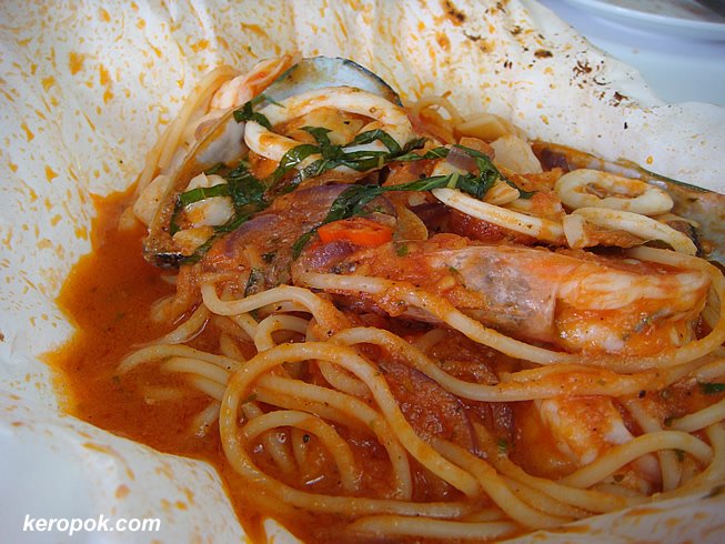 It’s spaghetti with saute squids, scallops, prawns, clams and mussels in light tomato sauce, garlic and white wine. It’s bagged by the way. I like this.