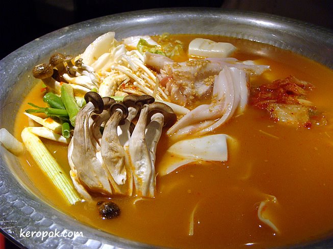 Stirring it a bit to reveal what’s inside. Kimchi, pork slices, different kind of mushrooms, tofu and cabbages.